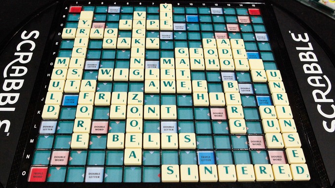 - Scrabble is a word game in which two to four players score points by placing tiles, each bearing a single letter, onto a game board which is divided into a 15x15 grid of squares.