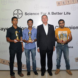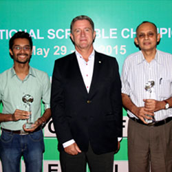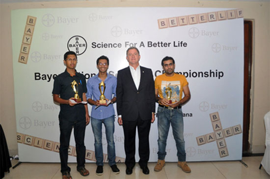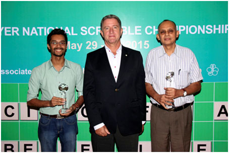 From Left to Right:Sherwin Rodrigues, Mr. Richard van der Merwe, Deputy Chairman and Managing Director, Bayer Group in India Mohan Chunkhat, winner of the Bayer National Scrabble Championship 2015